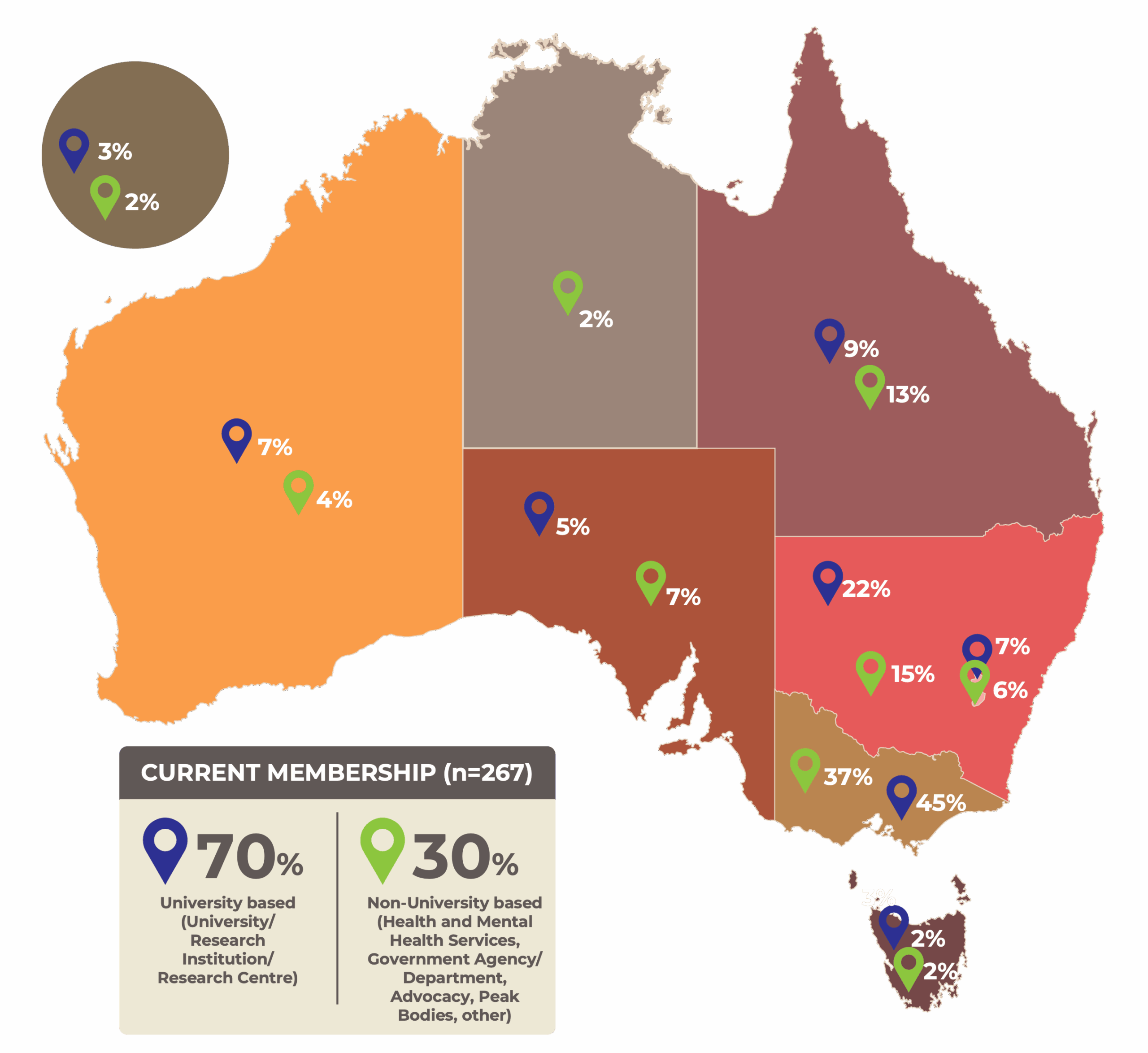 Membership includes lived-experience researchers in community organisations or governments working on mental health research projects and people with lived-experience who may partner with researchers for co-design or co-production research so that they connect with others.