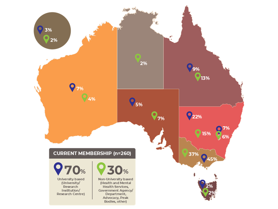 Membership includes lived-experience researchers in community organisations or governments working on mental health research projects and people with lived-experience who may partner with researchers for co-design or co-production research so that they connect with others.